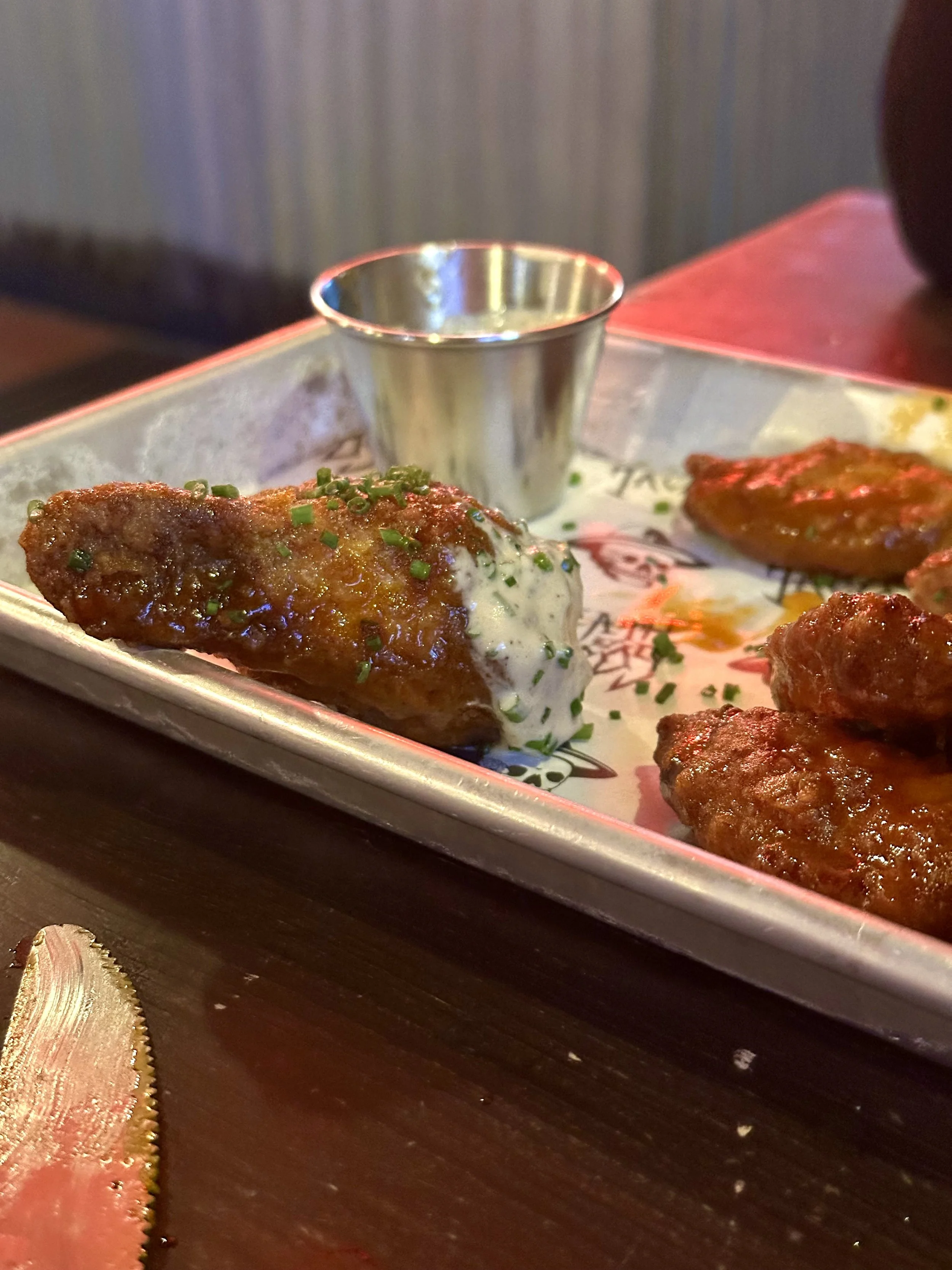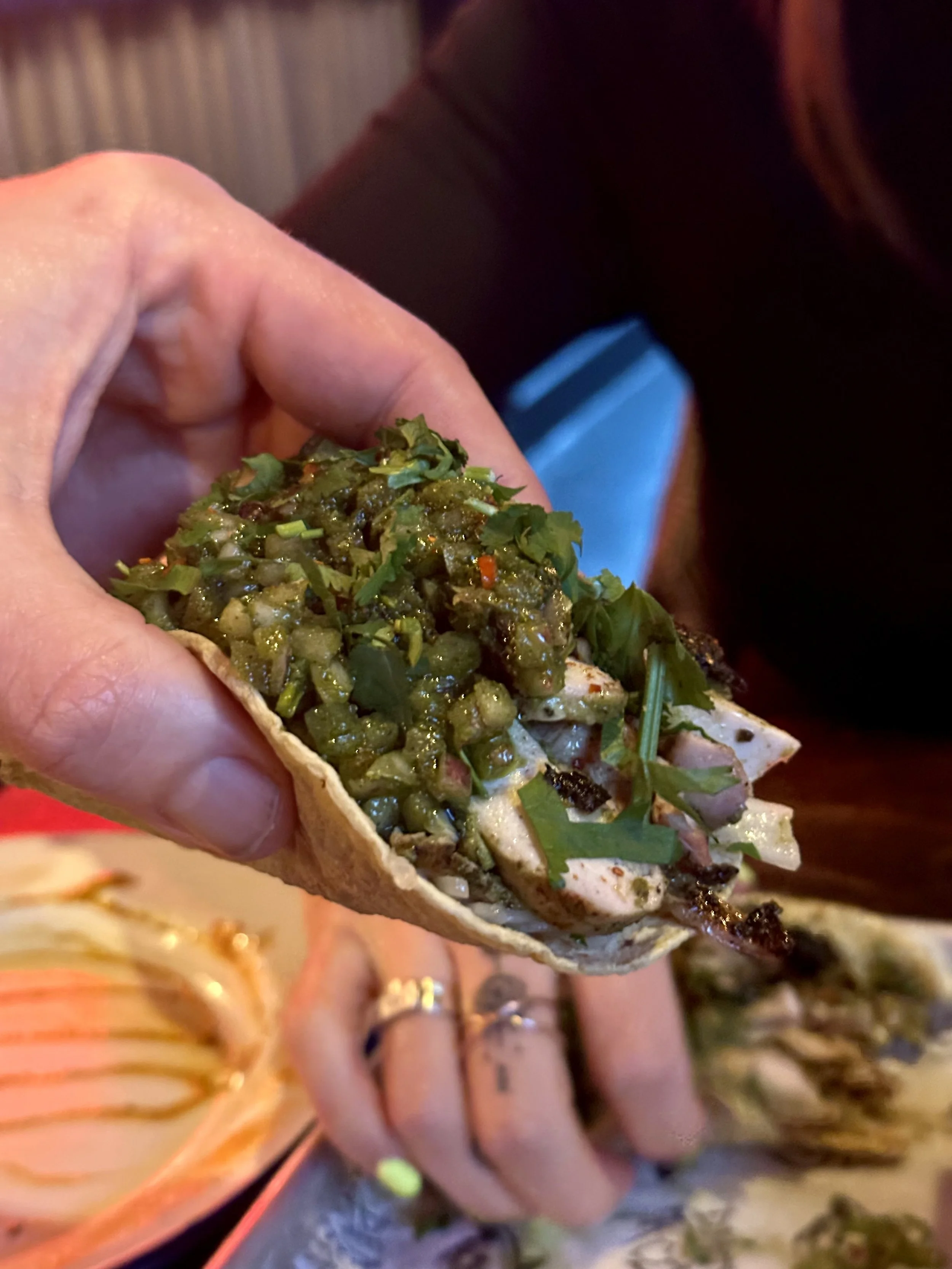 Some more of our good decisions included a tray of hot honey buffalo style chicken wings, some freshly fried nacho chips with heavily garlic studded guac and a couple of cocktails that all disappeared down our gullets under the same veil of us saying ‘oh yeah, that's delicious’. I had a chocolate, campari number which had a clever name I can’t remember and my wife’s spicy marg flew past her spicy marg exacting standards with ease. Both utterly delicious and matched the same authentic vibe as the rest of this place.