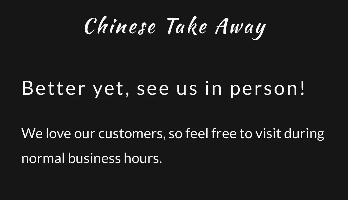 They have a great website. The full menu visible. In fact, you can order off it - magic! No more confusion over the phone, or ordering in person and waiting for ages. Unfortunately you can’t pay off it. That still has to be done in person, they also don’t deliver. So its an order online, pay in person and collect system - I don’t mind, this is progress. And the biggest news so far…….THEY TAKE CARD! This is a dream! The most forward thinking ordering and payment system so far! I am feeling good about this! So, the order is placed and collection time set…………